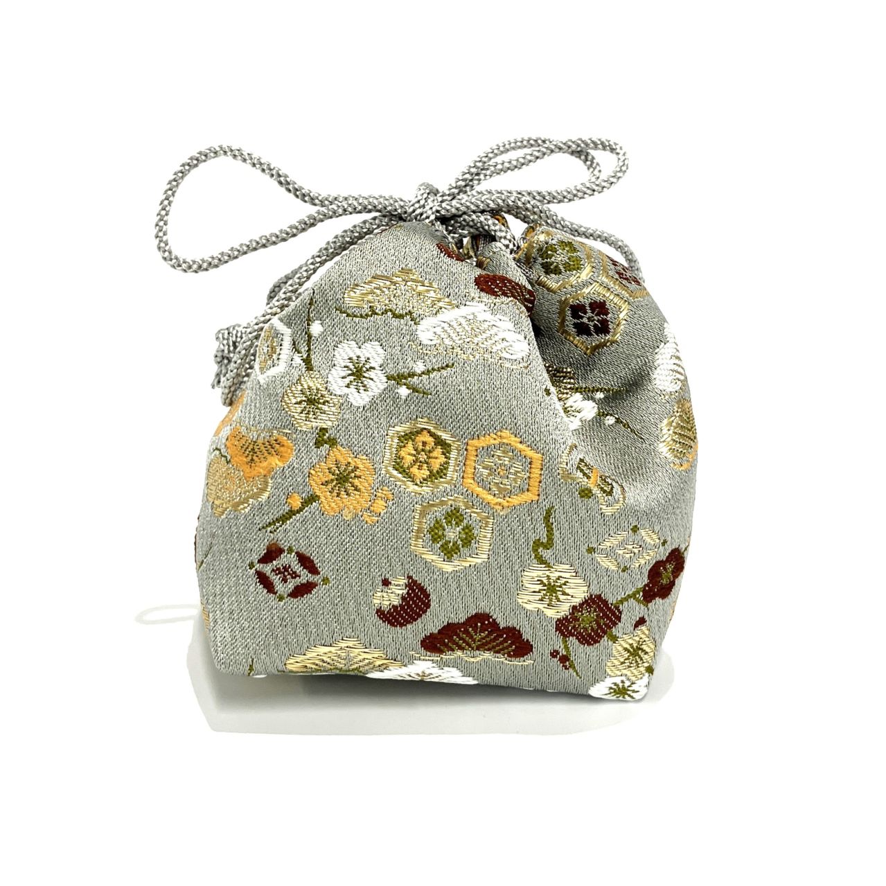 銀の地に松や梅、亀甲模様があしらわれたきらびやかな駒袋です。駒はもちろん、小物入れにすることも可能です。一品一品が手作りのため、写真とは色柄が微妙に異なります。ご了承ください。
