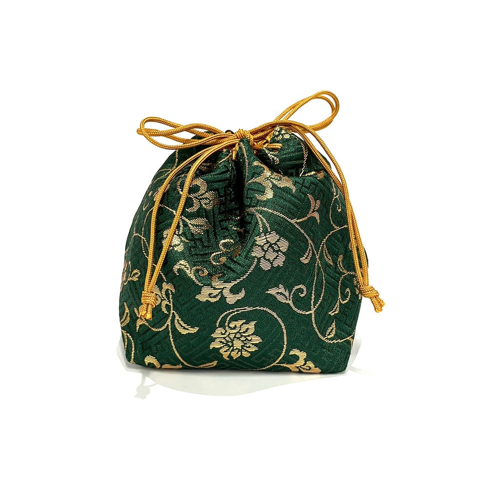 絹製の駒袋です。紗彩形の緑色の地に金の花があしらわれています。内側の布は黄色、紐の色も黄色です。駒だけでなく、小物入れとしてもお使いいただけます。一品一品が手作りのため、写真とは色柄が微妙に異なる場合がございます。あらかじめご了承下さい。