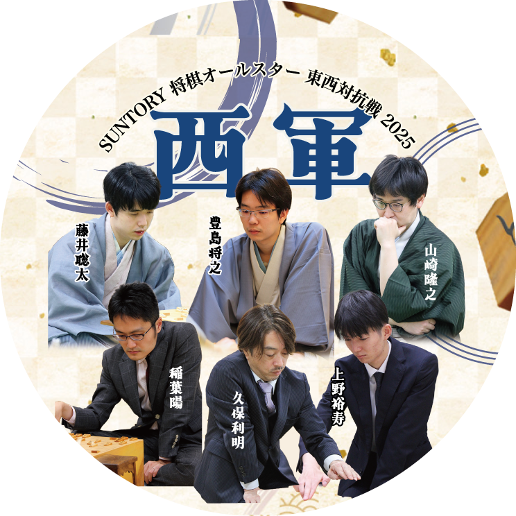 西軍:藤井聡太竜王・名人、豊島将之九段、山崎隆之九段、稲葉陽八段、久保利明九段、上野裕寿五段