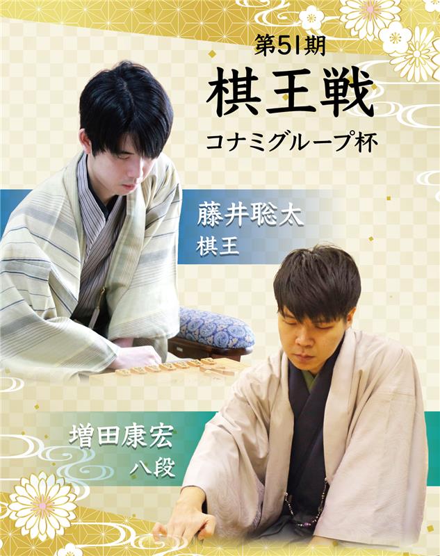 タイトル保持者である藤井聡太棋王と、挑戦者の増田康宏八段が対局に臨む姿がデザインされています。